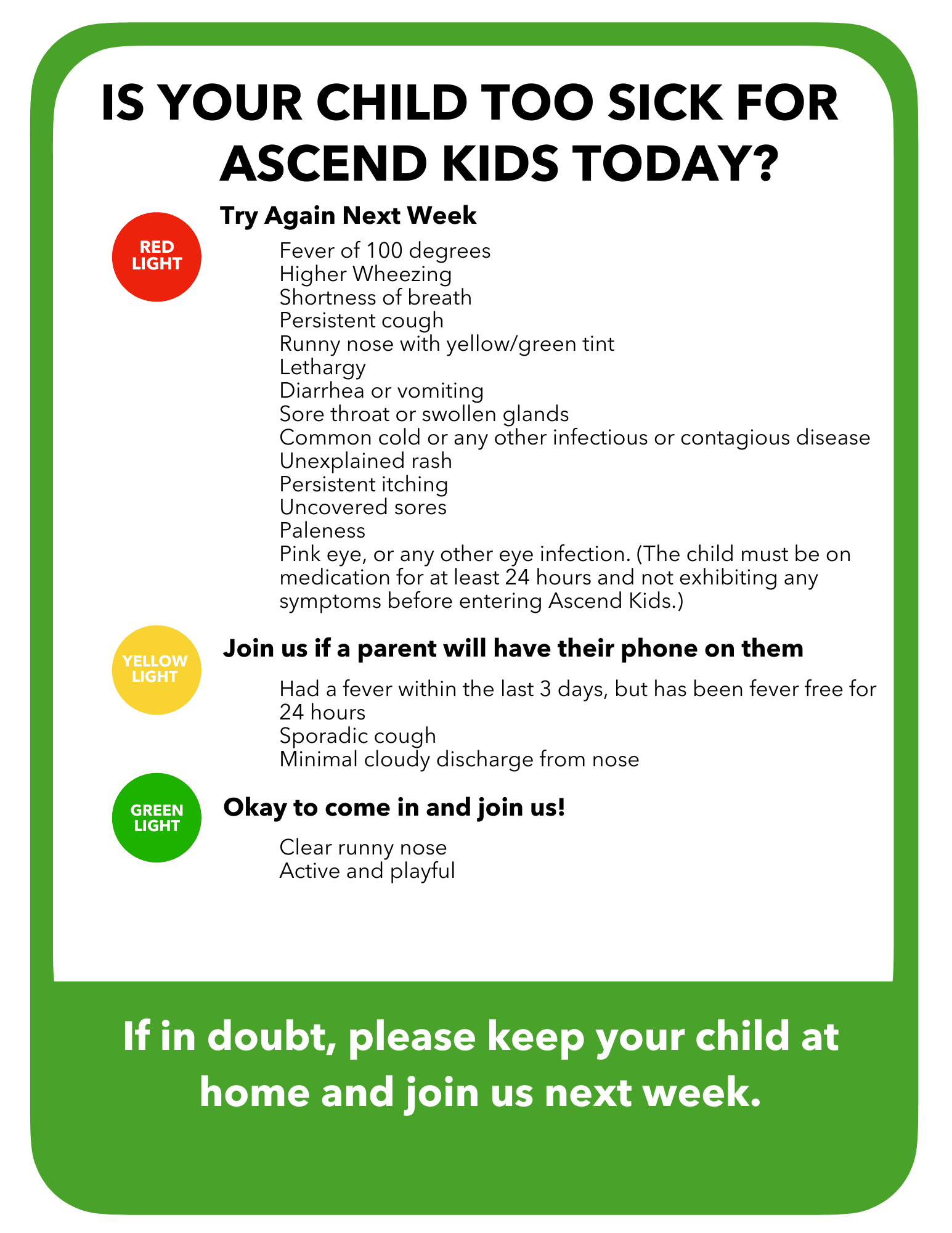At Ascend Kids, we care about keeping kids and volunteers healthy. Please check our sickness policy if you’re unsure whether your child is ready to attend.